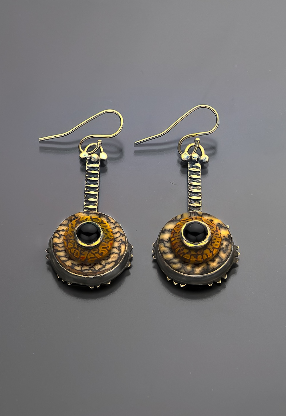 Dinosaur bone, black onyx, and unique Scandinavian birch wood are featured in this sterling silver earring set.The striking patterning and textures in each element reflect the world"s rich cultures. Stone on stone, bezel setting, and specialized riveting techniques were used to hand fabricate these earrings.These earrings have a gentle swing to them.14 inch wide, 2 14 inch in length.