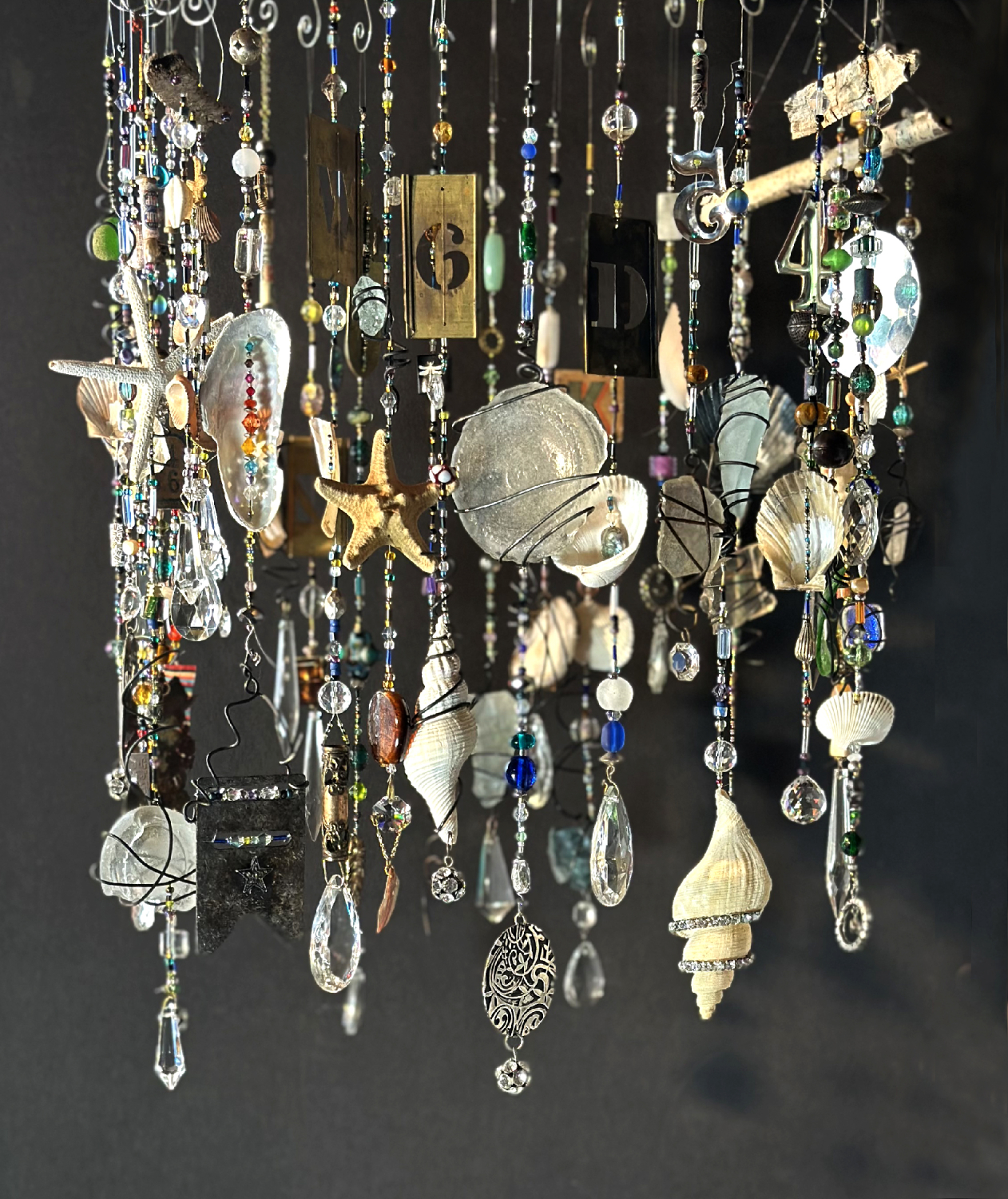 Hand strung found objects, "street bling" glass, wire wrapping and beads, catch the light and change the mood.